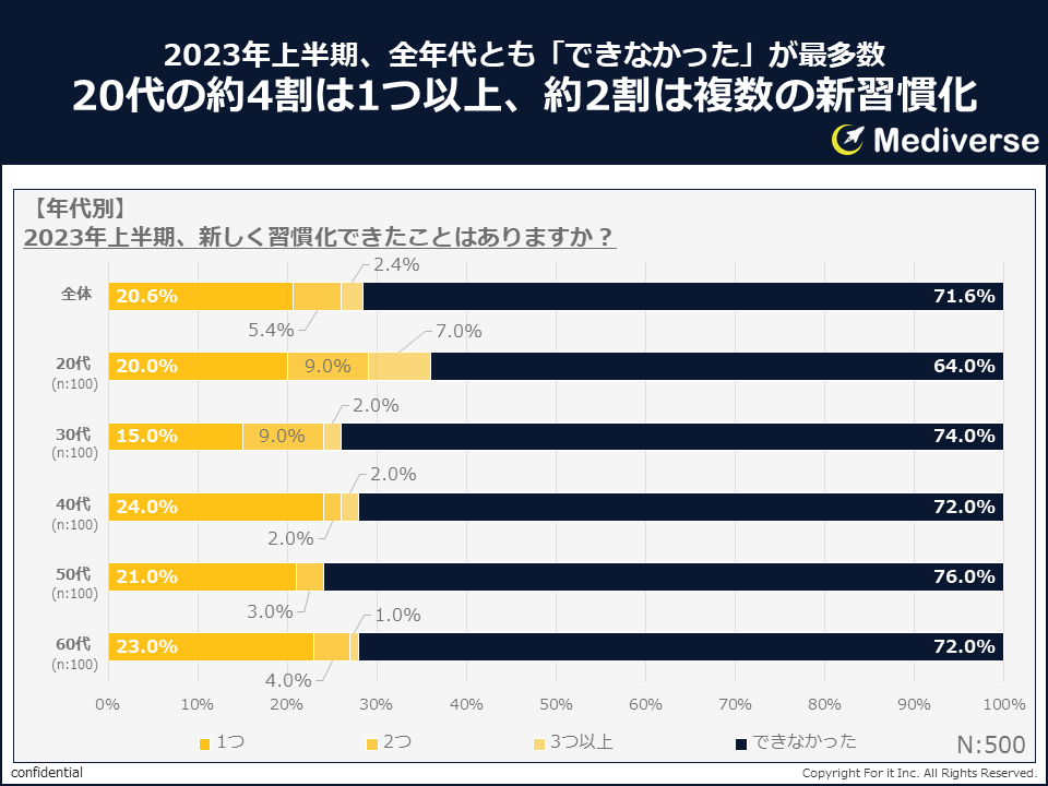 年代別に見ると、いずれの年代でも「新習慣化できなかった」が多数派となっていたものの、その割合がもっとも低かった20代は、約4割がなんらかの新習慣を始めており、そのうち約半数は複数の習慣化ができたと回答している。なお、2023年上半期、新習慣化が「1つ」できた割合がもっとも多かったのは40代であった。
