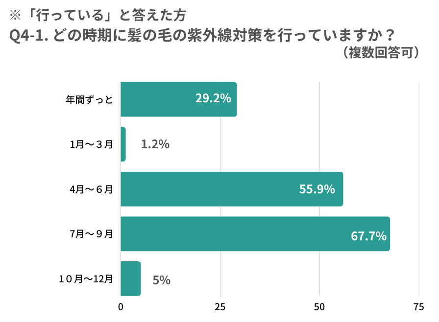 - 髪の紫外線対策を行う3割の方が、対策を行う時期は4月〜9月