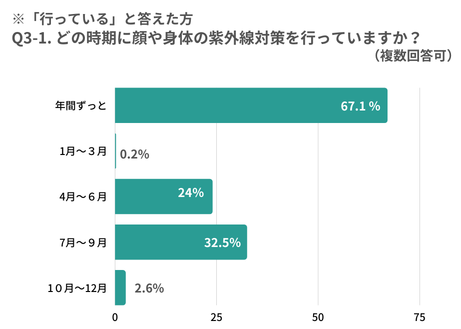 続いて、紫外線対策について伺いました。顔や体の紫外線対策は9割以上の方が行っている他、時期に関しても7割近くの方が「年間を通して対策している」と答えており、紫外線対策の重要性自体は広く浸透しているものと考えられます。