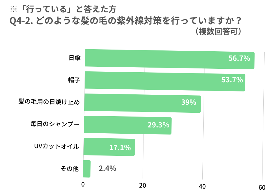 【最後に】のパートで詳しく記述いたしますが、紫外線対策は「髪の毛を紫外線そのものから守ること(日傘や帽子など)」と「紫外線を受けた頭皮や髪をあとからケアすること」の2つが大切になります。現在行われている対策を見ると、前者への意識は高いものの、後者があまり意識されていないのかもしれないという状況も見えてきました。