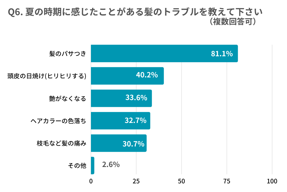 ちなみに、紫外線の強い時期に実感したことがある髪の毛のトラブルとしては、以下のような項目があげられました。