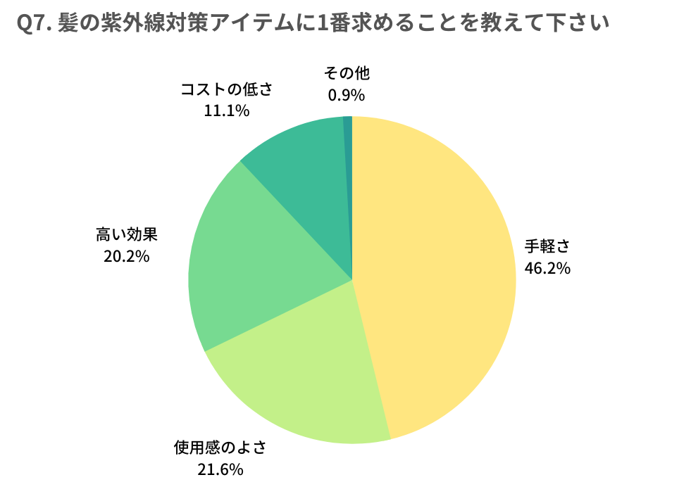 前項で述べた「顔や体が影響を受けるのと同様、髪の毛も紫外線の影響を受けることは知っているけれども対策まではできていない」方が多くいらっしゃるのだとしたら、そのハードルはどこにあるのでしょうか。「髪の紫外線対策アイテムに求めることは?」という最後の質問では約半数の方が「手軽さが重要」だという回答をしてくださいました。現状は「手軽にできる」紫外線対策のアイテムが消費者の皆様へ届いていないのかもしれません。