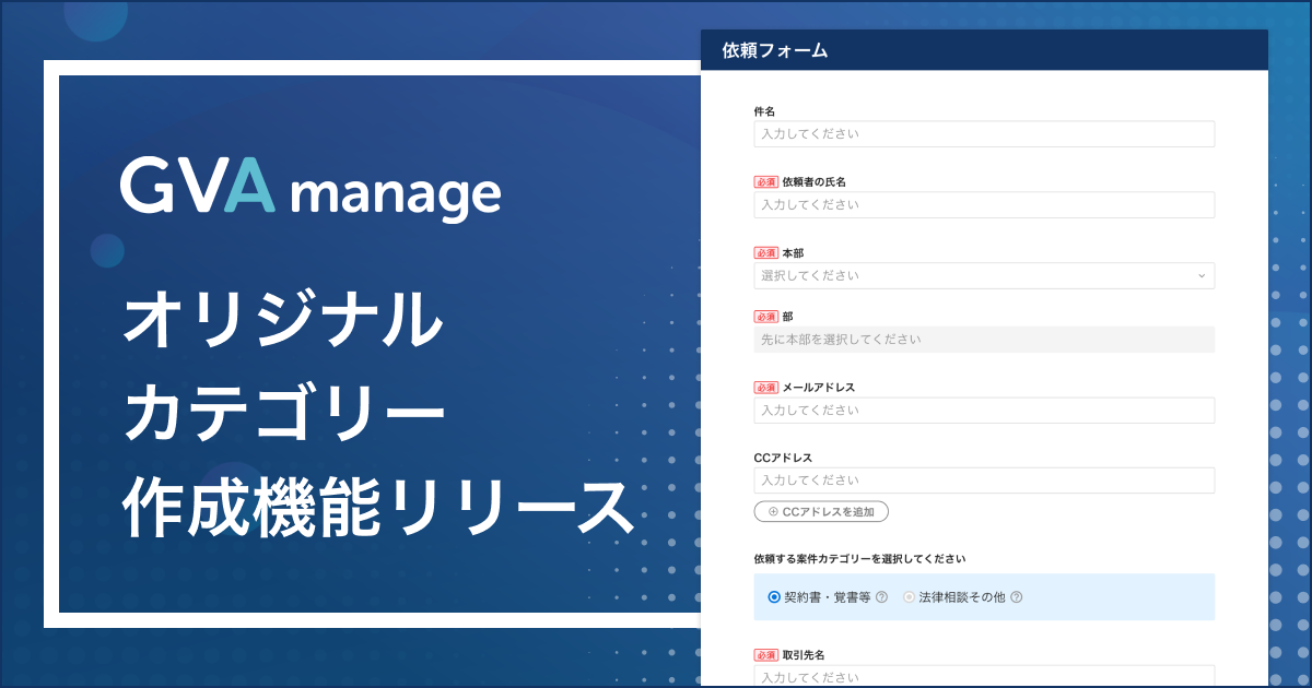 GVA manageでは、法務案件の性質に合わせて「契約書レビュー・契約書作成・法律相談その他」の3タイプの案件依頼を、プリセットのカテゴリーとして用意していましたが、ご利用企業さまから「秘密保持契約・業務委託契約など類型単位や、広告の薬機法確認・金融商品取引法の相談など、もう少し細かい粒度でカテゴリーを分けたい」というお声をいただくことも多く、GVA manageご利用企業の法務案件管理の受付ルールに合わせたカテゴリーの作成ができるように、オリジナルカテゴリーの作成機能をリリースいたしました。