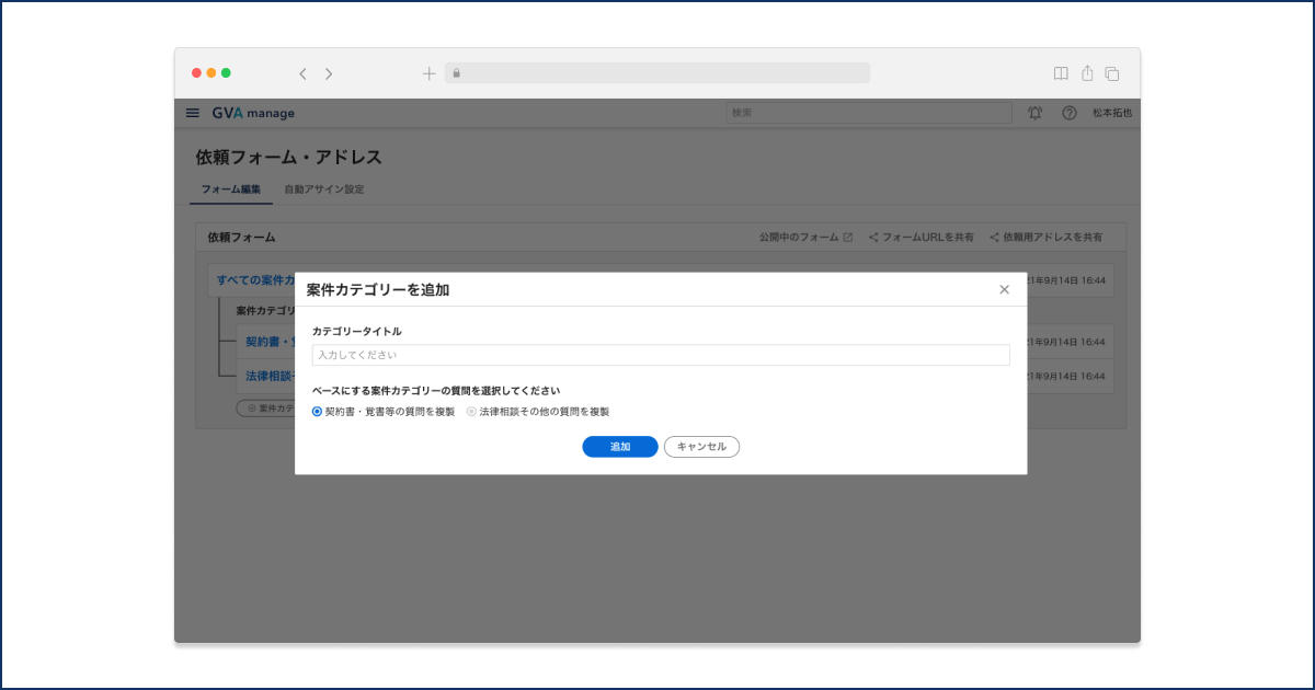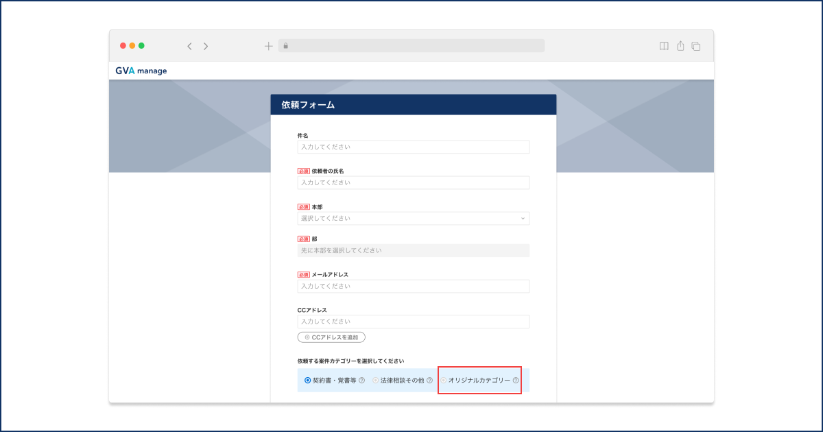 GVA manageの管理画面から案件依頼フォームを作成する際に、プリセットされている「契約書レビュー・契約書作成・法律相談その他」だけでなく、ご利用企業独自のオリジナルカテゴリーの作成が可能です。