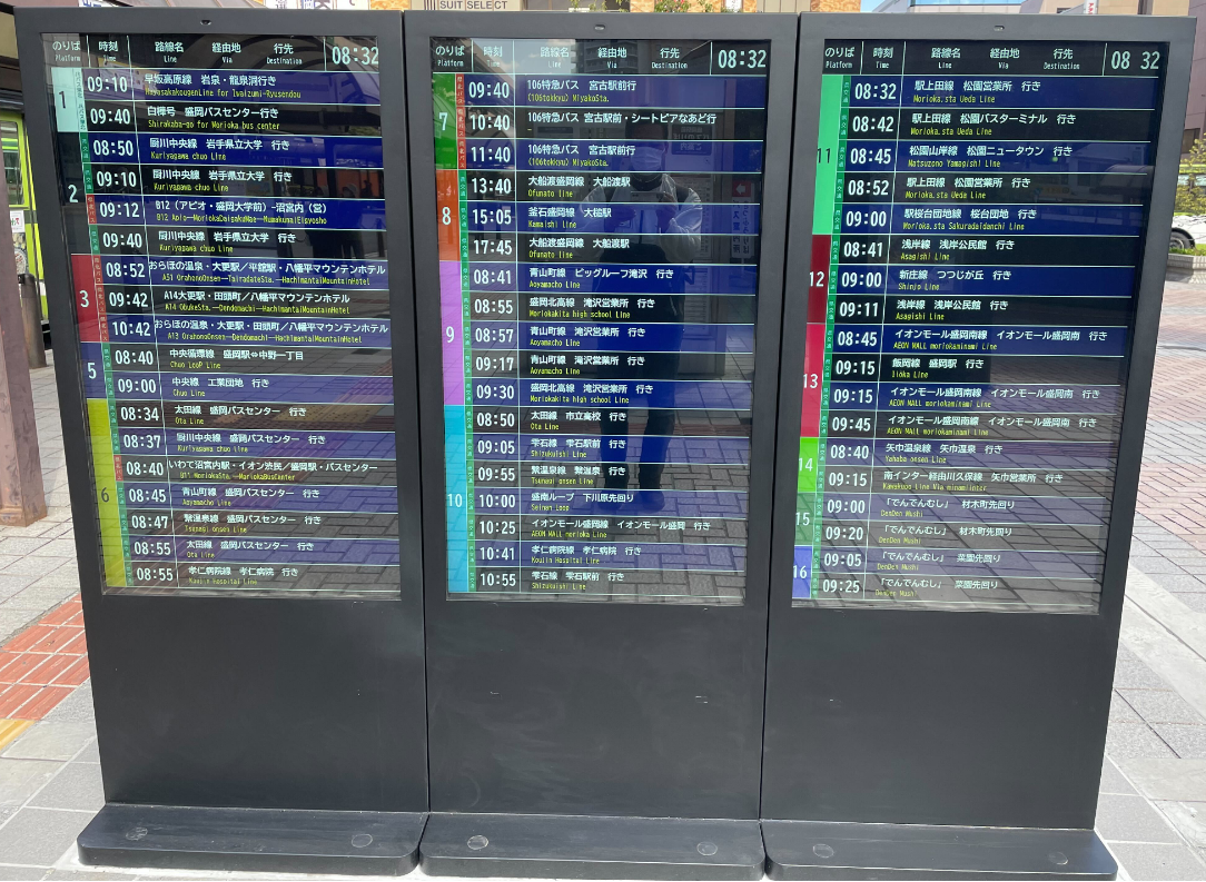 ・各社から提供されるオープンデータ(GTFS-JPおよびGTFS-RT)※1を活用し「盛岡市バスデータ統合表示システム」を構築しています。GTFS-JPとGTFS-RTを提供する事業者とGTFS-JPのみ提供される事業者、双方のバス便情報を、表示機(デジタルサイネージ)を設置する乗場毎の環境にあわせた表示デザインで表示します。