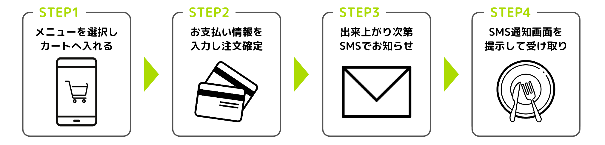 注文受付やレジ業務は全てシステムが代行し、店頭では利用者に料理をお渡しするだけ。非接触かつスピーディーなオペレーションが可能です。