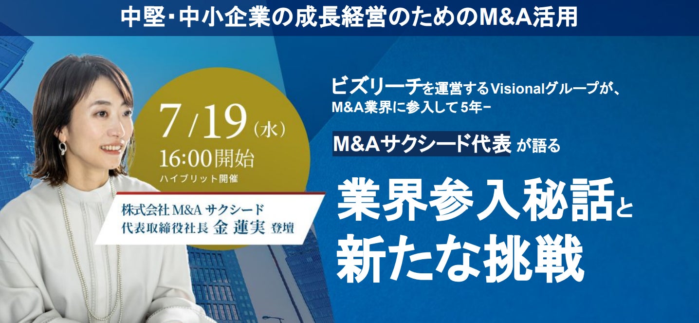 本セミナーでは、ビズリーチを運営するVisionalグループのM&A業界参入秘話と、オープンでフェアなM&A市場の実現に向けた新たな挑戦についてお話します。企業をより成長させていくための経営の選択肢として、M&Aの可能性に興味をお持ちの方はぜひご参加ください。