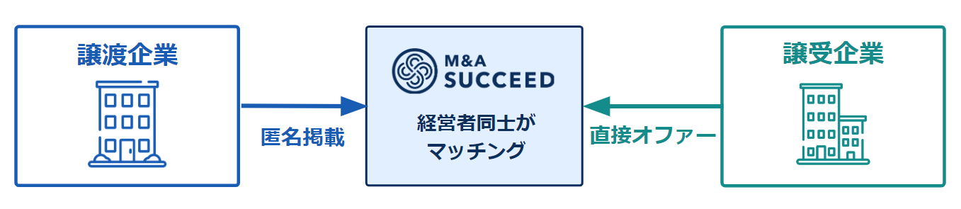 「M&Aサクシード」は、譲渡企業と譲受企業をオンライン上でつなぐ法人・審査制M&Aマッチングサイトです。譲渡検討企業のオーナーは「M&Aサクシード」に会社や事業の概要を匿名で登録でき、譲受候補企業はその情報を検索して閲覧できます。譲受候補企業は興味を持った譲渡検討企業へ直接アプローチできるため、譲渡検討企業のオーナーにとっては、潜在的な資本提携先の存在や、自社の市場価値を把握するきっかけになります。これにより、経営の選択肢の一つとしてM&Aを早期から検討できます。2017年11月にサービスを開始し、全国の譲渡検討案件が累計15,500件以上(掲載中4,100件以上)登録され、利用中の譲受候補企業は8,800社以上です。(2023年6月時点)