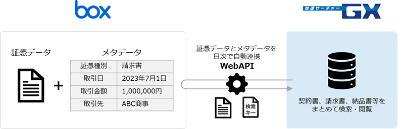 そこで今回、「快速サーチャーGX」と「Box」を連携し、「Box」に登録している証憑とメタデータを「快速サーチャーGX」に自動で取り込み、安心・安全に電子帳簿保存法対応を実現できるオプションの提供を開始しました。