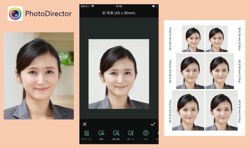 元写真の背景を自動で除去、10色のシンプルな証明写真用背景テンプレートから選択。
