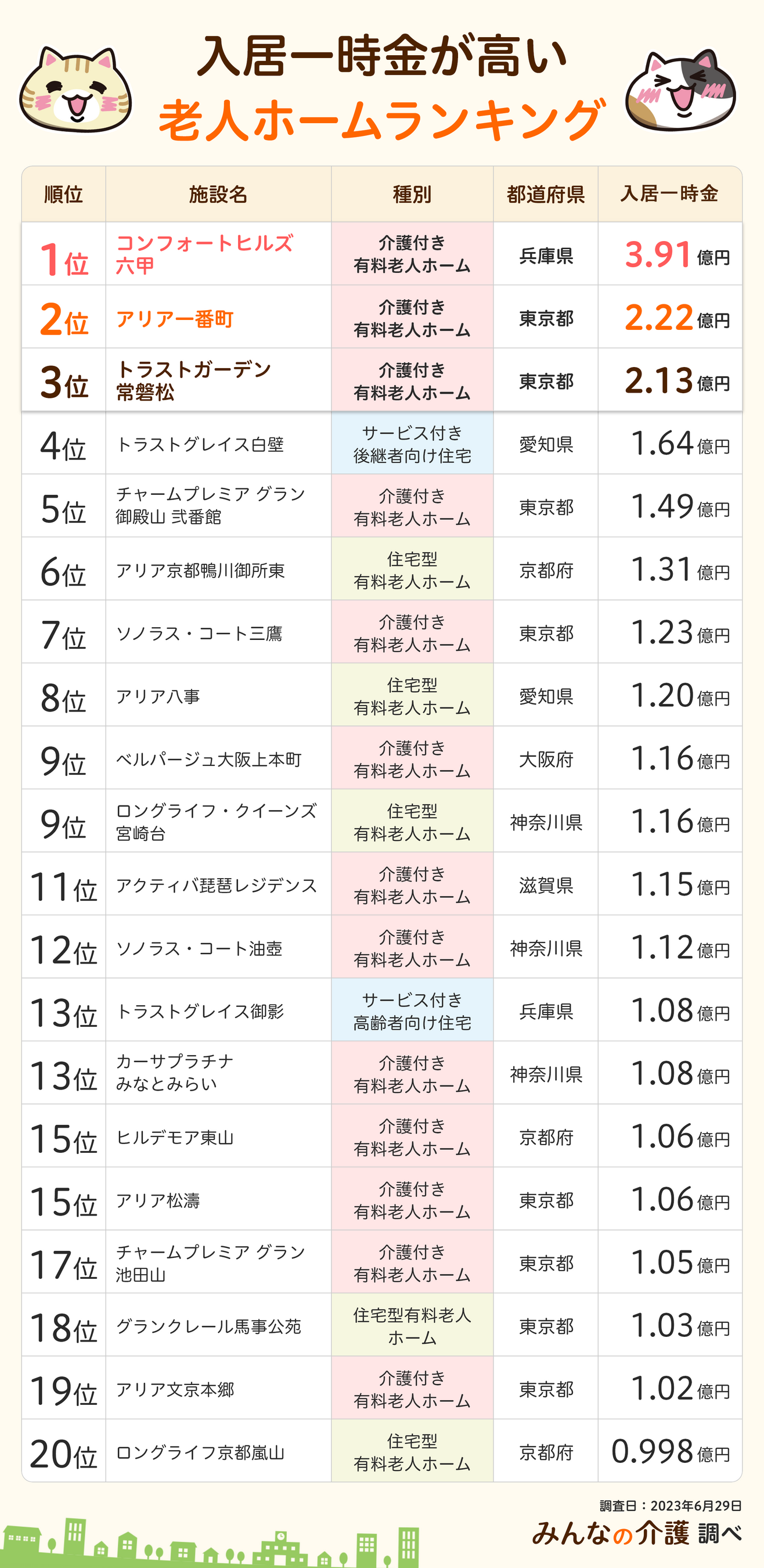 方法 みんなの介護に掲載中の全施設(51,901件)のうち入居一時金の上限値が高い順に上位20施設を集計