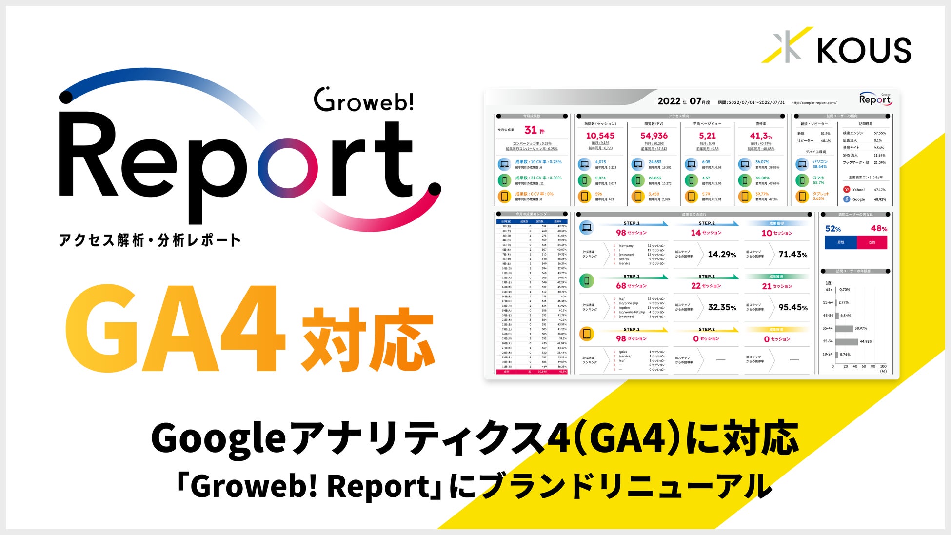 「Groweb! Report」は、Googleが提供するWeb解析サービス「Googleアナリティクス」から得られる情報を分析し、Web戦略に役立てるためのレポートツールです。今回のバージョンアップでは、GA4に対応したレポート、管理画面のUI / UX 向上、さらには管理画面上でのWeb改善施策の管理機能を追加しました。従来のユニバーサルアナリティクス(UA)に比べ、より詳細な項目が取得可能となったGA4の数値項目を、Groweb! Report独自の分かりやすいレポートに集約し可視化します。ITやデジタルを苦手と考える方でも、Web戦略や改善に反映するための情報を把握することができます。