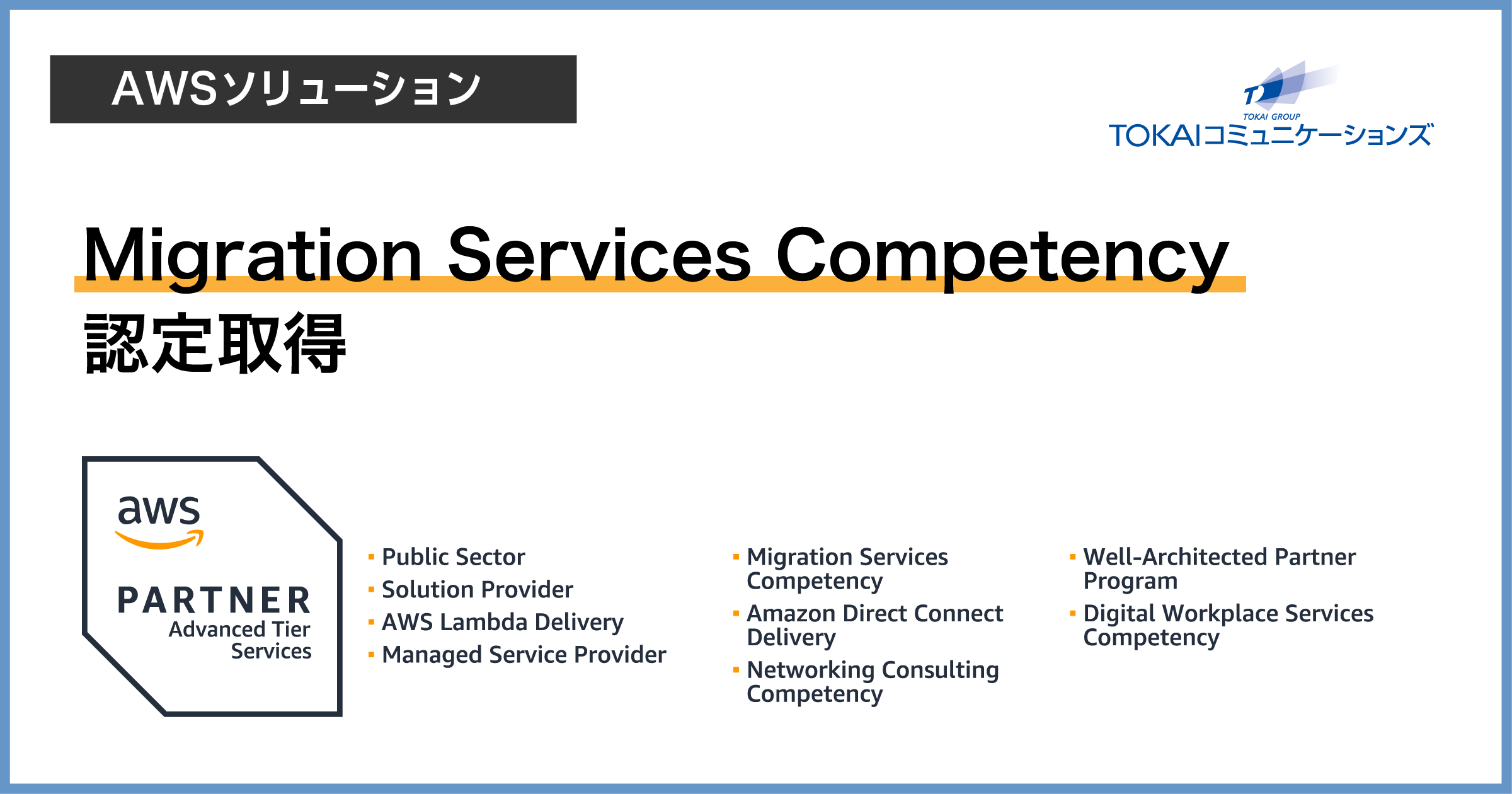 「移行コンピテンシー」認定は、AWSの高い水準による審査のもと、基幹システムや業務システムのAWSへの移行における設計から移行作業、運用に至る全工程の専門知識や豊富な成功事例を有するパートナーを認定するものです。