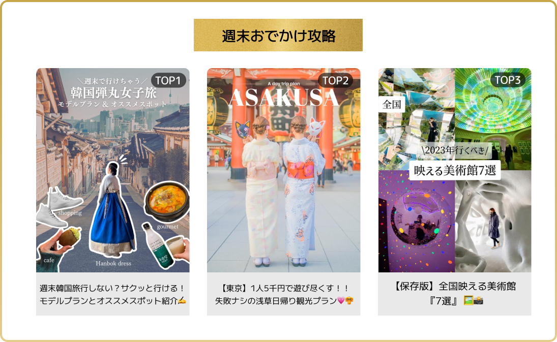 Lemon8では、「週末の過ごし方」について、トレンドスポットやNEWスポットなどのおでかけ先を探す傾向が顕著。中でも、「韓国に弾丸で行く方法」「映える美術館まとめ」「着物女子旅」など、「女子旅」で楽しめるおでかけプランが人気。
