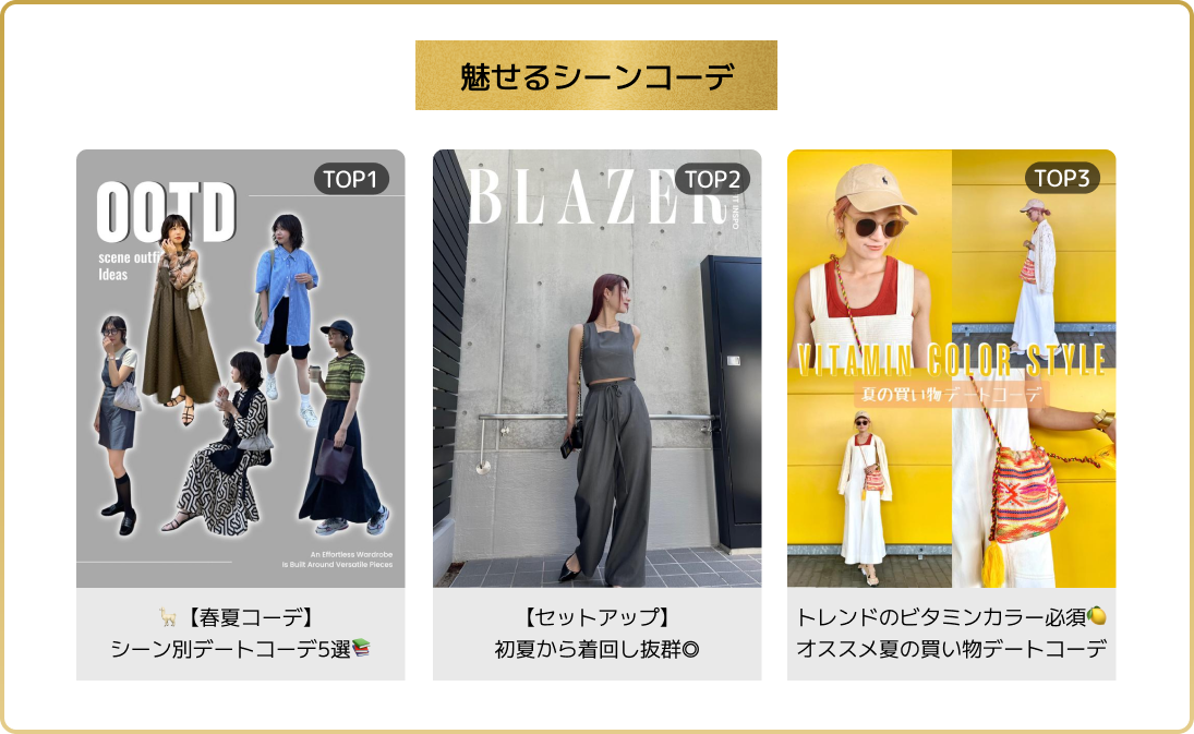 デートや通勤、夏のイベントなど、お出かけシーンに合ったファッションを紹介するコンテンツが人気!夏のイベントに映えるビタミンカラーアイテムや、毎日の通勤の参考になるカジュアルスタイルなどが入賞。
