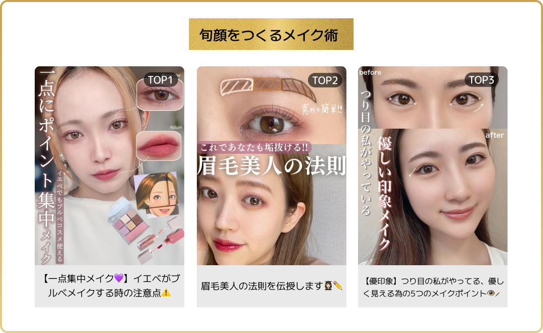 ・ポイント💡 メイク初心者にもおすすめ!誰でも簡単にできる垢抜けHOWTO投稿を中心に、丁寧にステップごとに紹介しているよ!