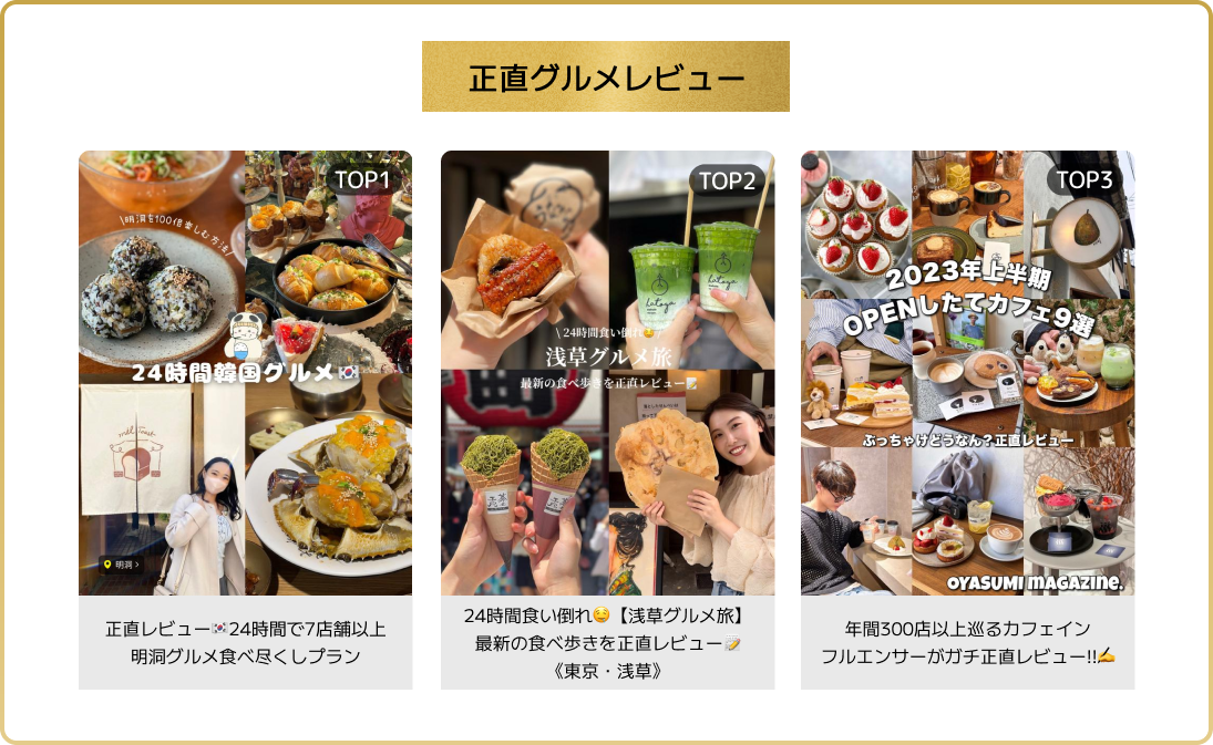 食べ物の感想だけではなく、お店の雰囲気や待ち時間など、行った人にしかわからないリアルな情報を「正直」にレビューしている投稿が読者にとって参考になった。さらに、新型コロナウイルスが5類感染症に移行し、お出かけする機会が増えてきた影響から「旅行先のグルメ」や「食べ歩きグルメ」に注目が集まった。