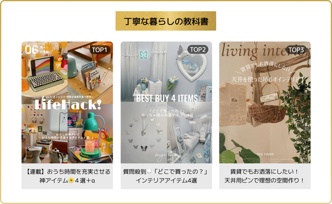 お部屋の中でお洒落に、丁寧に暮らすコツを徹底紹介!ひとつあるだけでも気分があがるアイテムの紹介や、空間ディプレイ方法の投稿が多く集まった。見ているだけでも楽しいお部屋の写真と、クリエイターの加工センスにも注目!
