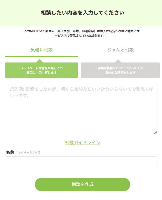 相談は、「気軽に」実施することも、より詳細な回答が欲しい場合はプロフィールを入力して「ちゃんと」相談することも可能です。