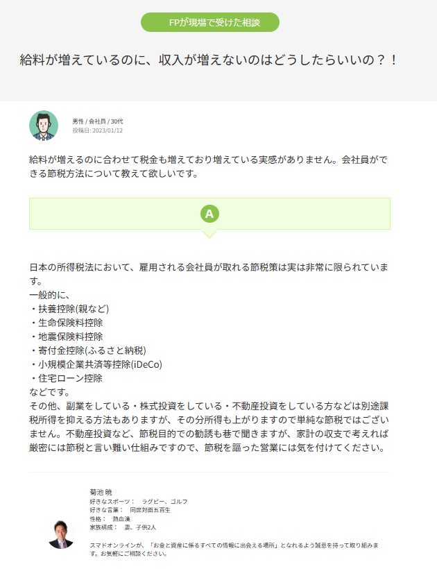 本サービスでは、自分と同じ悩みや相談が見られる他、現場で年間1000件のリアルな悩みに答えているプロのFPに相談をすることができます。サービスの利用は、全て無料となっています。