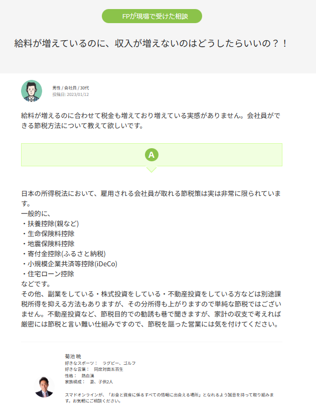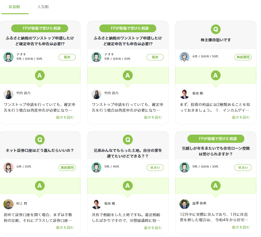 本サービスでは、自分と同じ悩みや相談が見られる他、現場で年間1000件のリアルな悩みに答えているプロのFPに相談をすることができます。サービスの利用は、全て無料となっています。