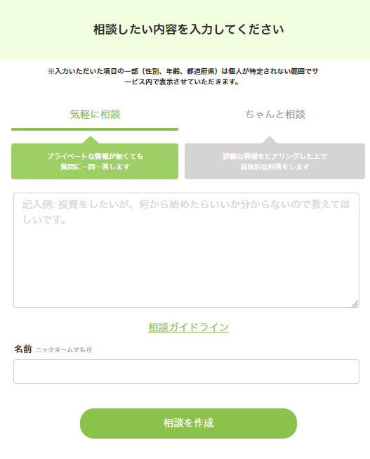 相談は、「気軽に」実施することも、より詳細な回答が欲しい場合はプロフィールを入力して「ちゃんと」相談することも可能です。