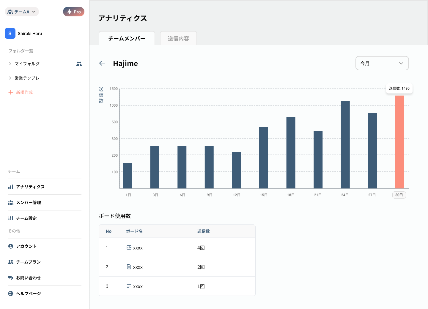 アナリティクス機能によりそれぞれが送信した件数・アプローチ数が定量的に測れます。よく利用されている資料が明確になるので不要な資料・優先的に改善すべき資料が把握できます。取得データは人事評価にも活用もでき、今まで不透明だったスマホ業務を見える化します。