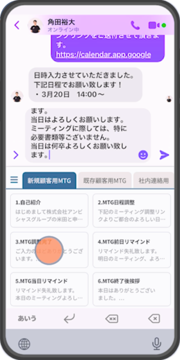 スマホのキーボードに定型文・資料・画像など利用頻度の高いコンテンツを登録することでワンタップで送信できます。キーボードをチームで共有することで、全ての営業担当者の会話をより効果的にします。