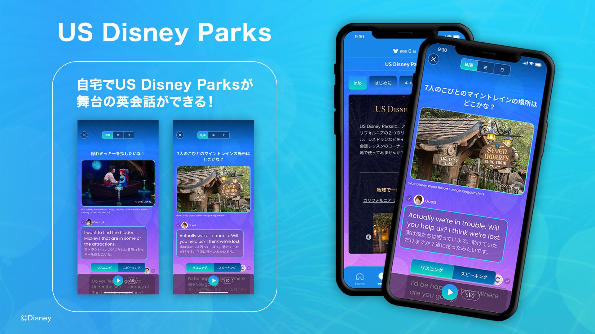 旅行英会話をアプリの音声認識機能を使ってトレーニングできる「US Disney Parks」のコーナーでは、アメリカのディズニーパーク&リゾートを舞台に「食事」「買い物」「移動」「ホテル」など海外旅行で欠かせない会話の他、「キャスト」「アトラクション」「ショー」など「ディズニー ファンタスピーク」ならではの英会話をご用意しました。ご自宅でスマホを使って英会話の練習ができるだけでなく、現地で使えるフレーズ集としてもご活用いただけます。