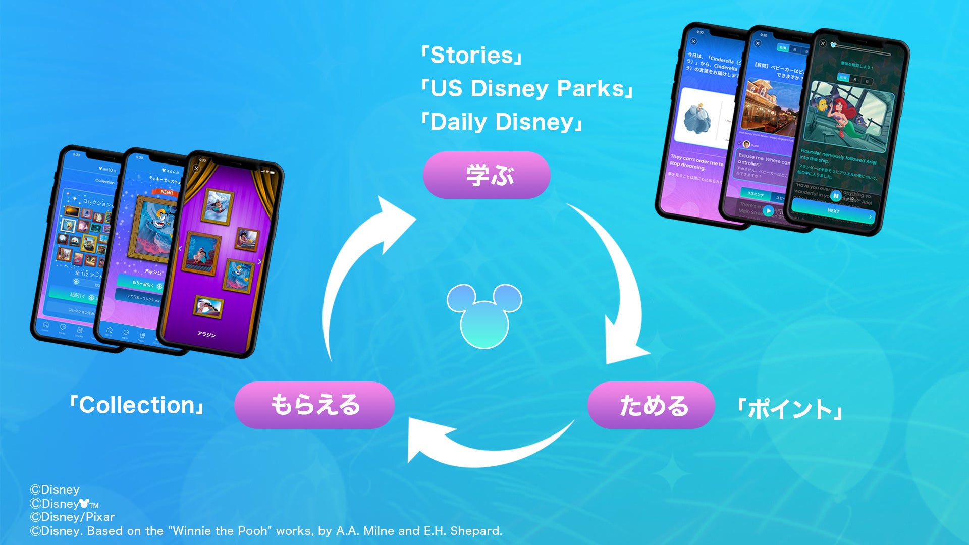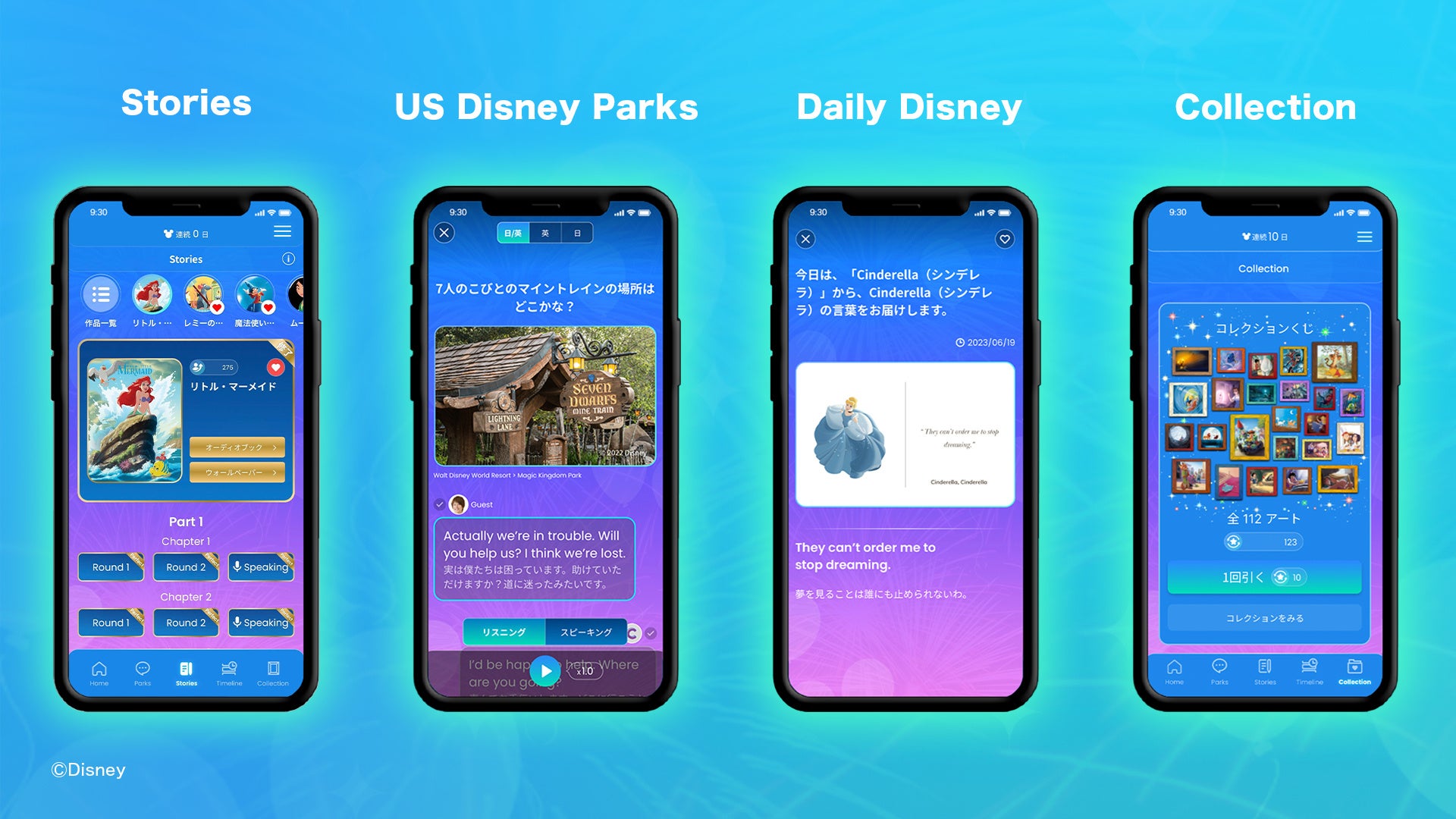 「ディズニー ファンタスピーク」は、「英語を学び直したいけれども、何から始めていいかわからない……」「今度こそ挫折せず学習を続けたい……」と願う大人の方のための、ディズニー作品やピクサー作品で学ぶ英語学習アプリです。3つの学習コンテンツ(「Stories」「US Disney Parks」「Daily Disney」)とリワードコンテンツ(「Collection」)が融合したゲーミフィケーションを導入し、「学ぶ」→「(ポイントを)ためる」→「(デジタルアートを)もらえる」という学習サイクルによる継続的な学びを促します。