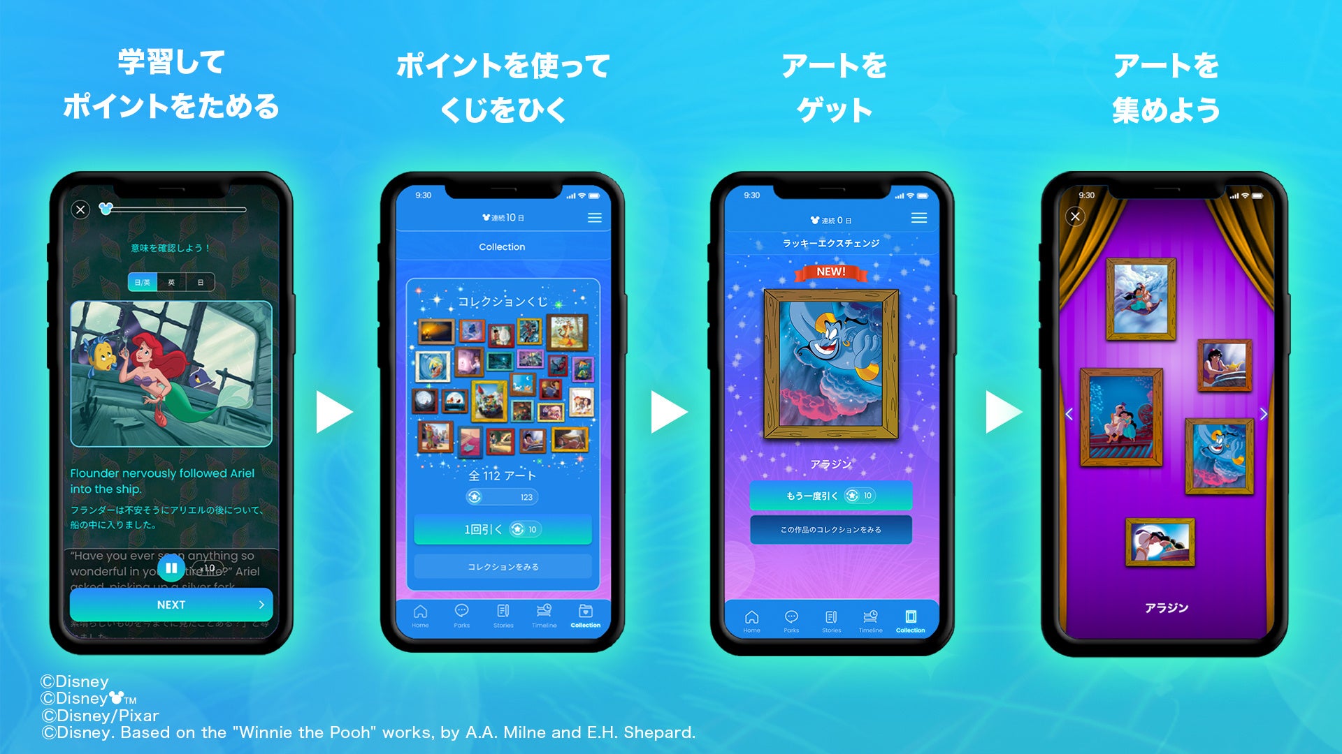 さらに、先日追加された「Collection」コーナーでは、学習でためたポイントでくじをひき、ディズニー作品やピクサー作品のデジタルアートコレクションを楽しむことができます。アプリでの学びと楽しさを融合させ、「学ぶ」→「ためる」→「もらえる」→そして再び「学ぶ」というときめきのある学習サイクルに乗り、学びのモチベーションを自然と維持することを促します。