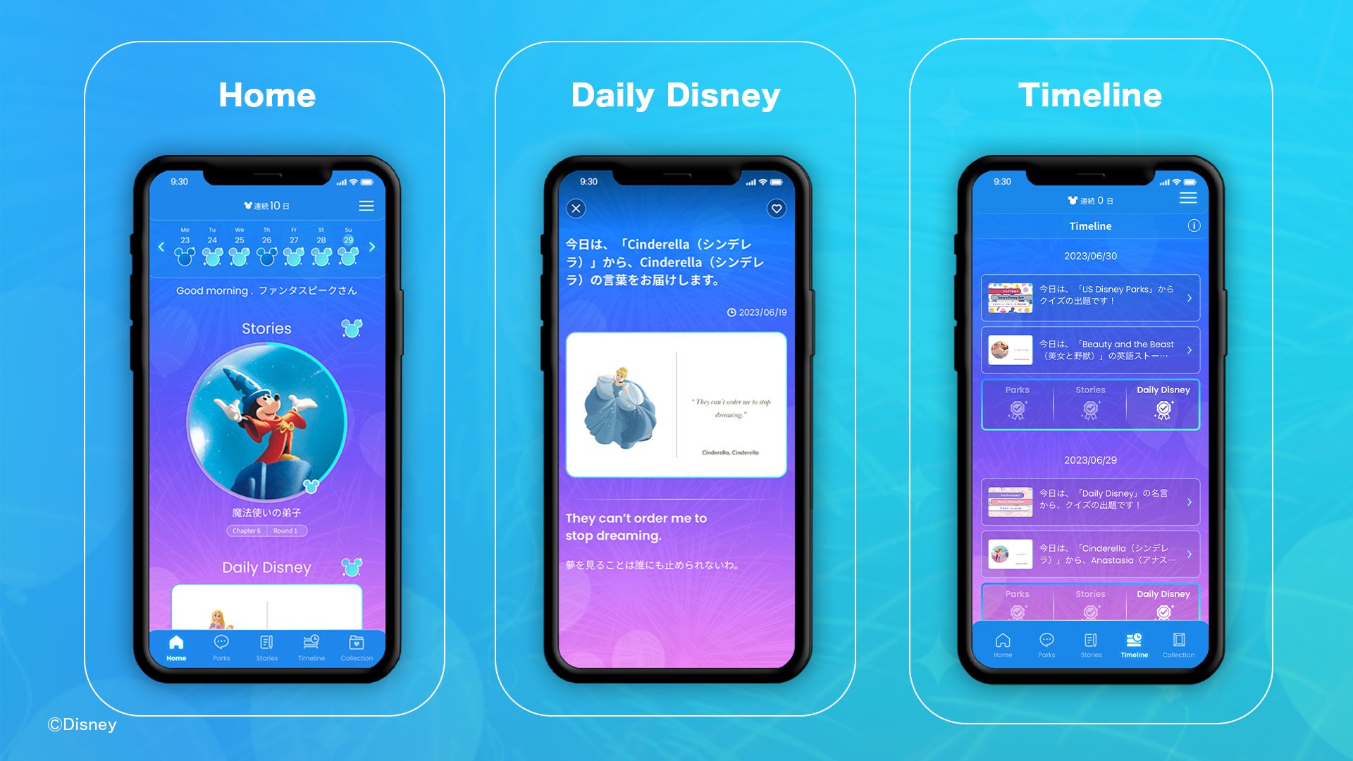 「ディズニー ファンタスピーク」は、「英語を学び直したいけれども、何から始めていいかわからない……」「今度こそ挫折せず学習を続けたい……」と願う大人の方のための、ディズニー作品やピクサー作品で学ぶ英語学習アプリです。3つの学習コンテンツ(「Stories」「US Disney Parks」「Daily Disney」)とリワードコンテンツ(「Collection」)が融合したゲーミフィケーションを導入し、「学ぶ」→「(ポイントを)ためる」→「(デジタルアートを)もらえる」という学習サイクルによる継続的な学びを促します。