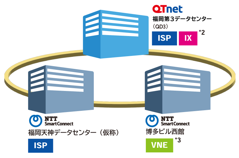 福岡市中心部にてNTTスマートコネクトの福岡天神データセンター(仮称)ならびにNTT博多ビル西館とQTnetの福岡第3データセンター(QD3)を結ぶ光回線(芯線)による相互接続サービスを提供いたします。
