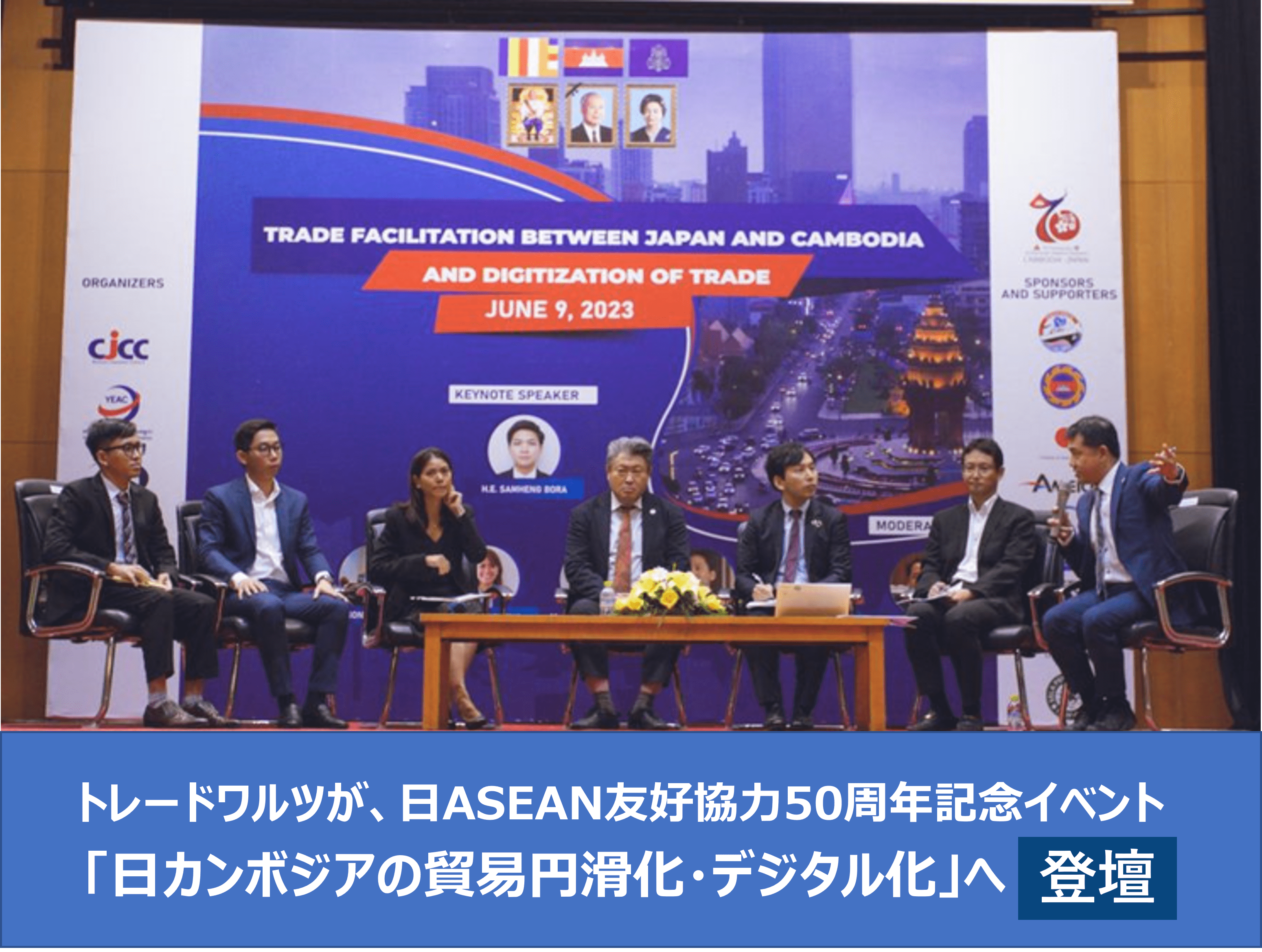 トレードワルツは3月タイ開催のイベントシリーズに登壇しておりましたが、今回は6月カンボジア開催のものに登壇した形となります。主催はカンボジア・日本ビジネス投資協会(CJBI)が務め、「貿易の円滑化・デジタル化」をテーマに日・カンボジアの政府・民間専門家が講演・パネルディスカッションを実施しました。