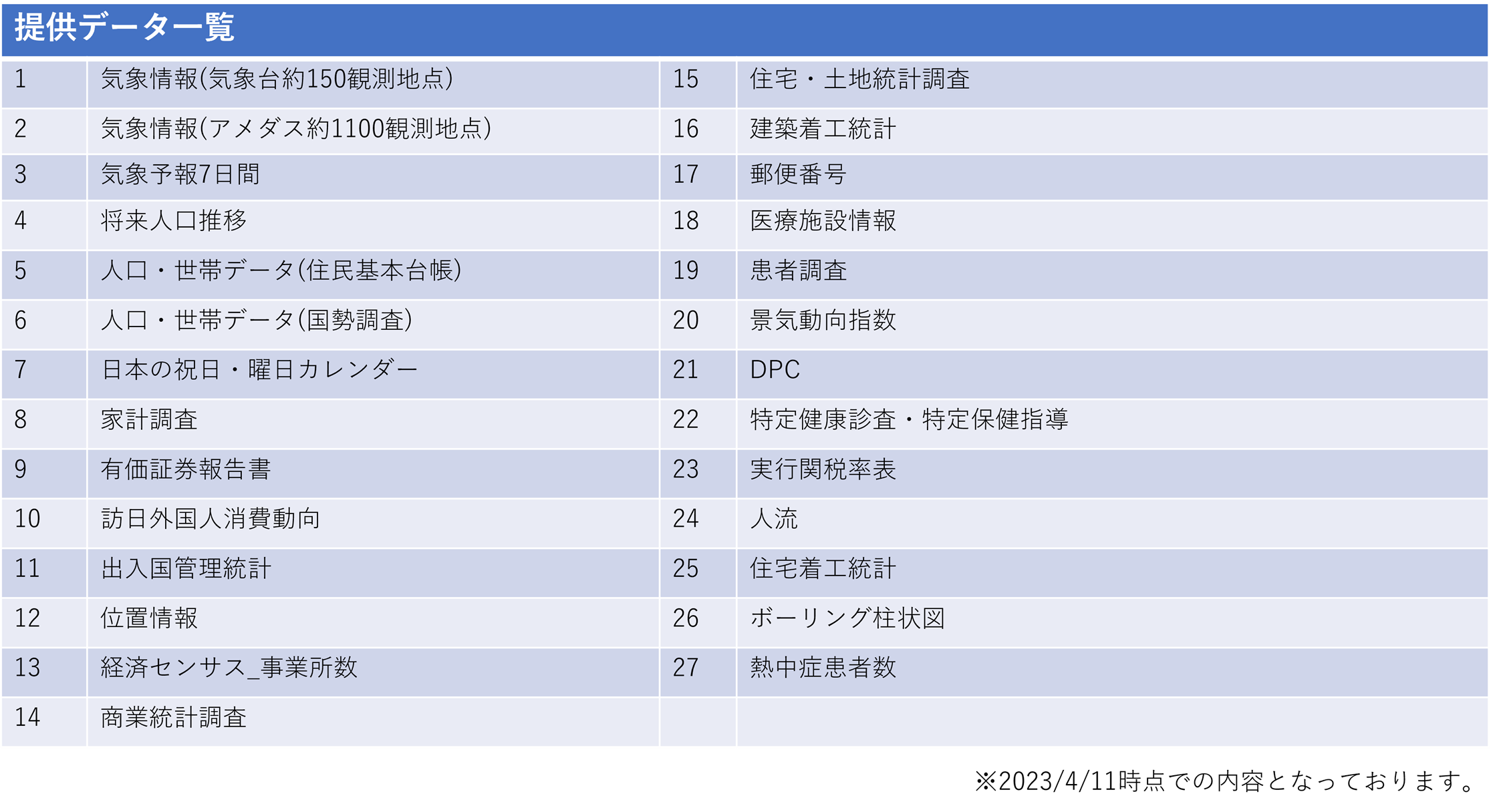 SnowflakeマーケットプレイスよりCO-ODE利用をお申込みいただくと、CO-ODEで提供している全27種類すべてのデータを利用できます。