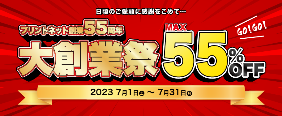 日頃のご愛顧に感謝を込め、2023年7月1日(土)~7月31日(月)の期間中、大創業祭として売れ筋商品7種、最大55%OFF、【フライヤー・チラシ印刷 片面カラー 100枚810円→ 365円】で注文できるキャンペーンを実施いたします。