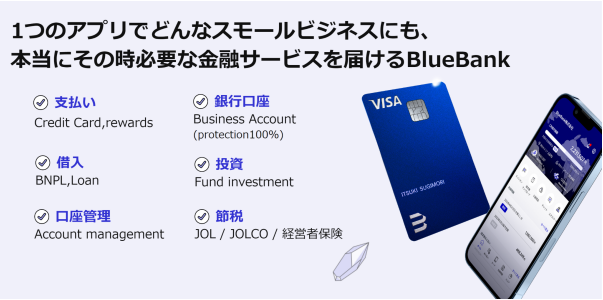 『BlueBank』は、持続的な成長を求めるスモールビジネスの経営者を対象とし、請求書あと払い・ビジネスカードなどの経営に必要なファイナンスサービスを提供するスマートフォンアプリです。日々の支払いや銀行口座残高などの一元管理機能、経営者のモチベーションを喚起する優待プログラム、ビジネスを成長させるための実行支援を行うカスタマーサクセスによりユーザーの皆様の挑戦を支え、「その時、本当に必要な金融サービス」を実現する法人向けファイナンスプラットフォームの創出を目指しています。