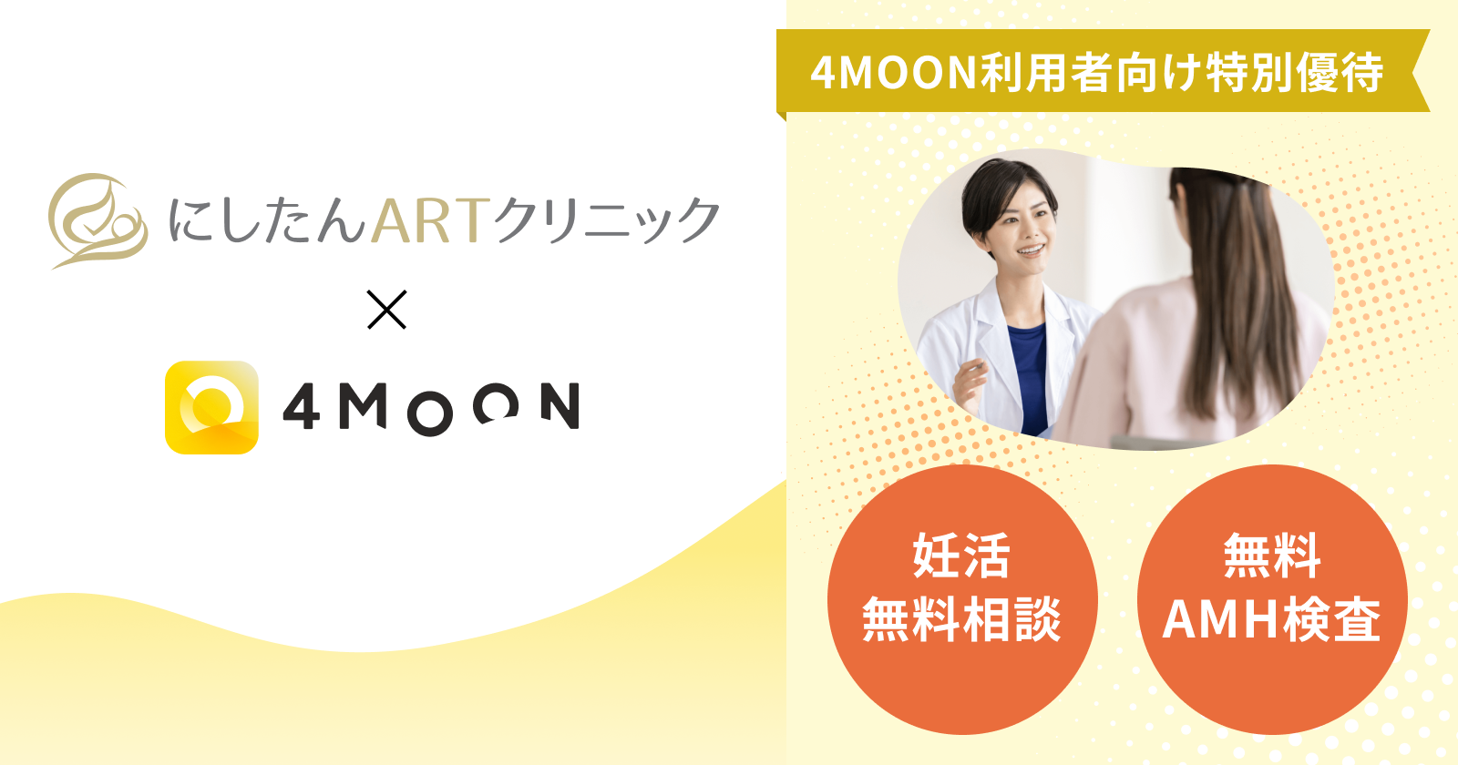 『4MOON』は、妊娠を希望している利用者の割合が多く、排卵日予測やパートナー共有、妊娠しやすさの表示、体温計からのデータ転送、基礎体温のグラフ化、グラフの端末保存などが無料で利用できます。にしたんARTクリニックから無料AMH検査と無料相談窓口の提供を受けることで、これまで以上に女性の心と身体に寄り添うサービスを目指します。