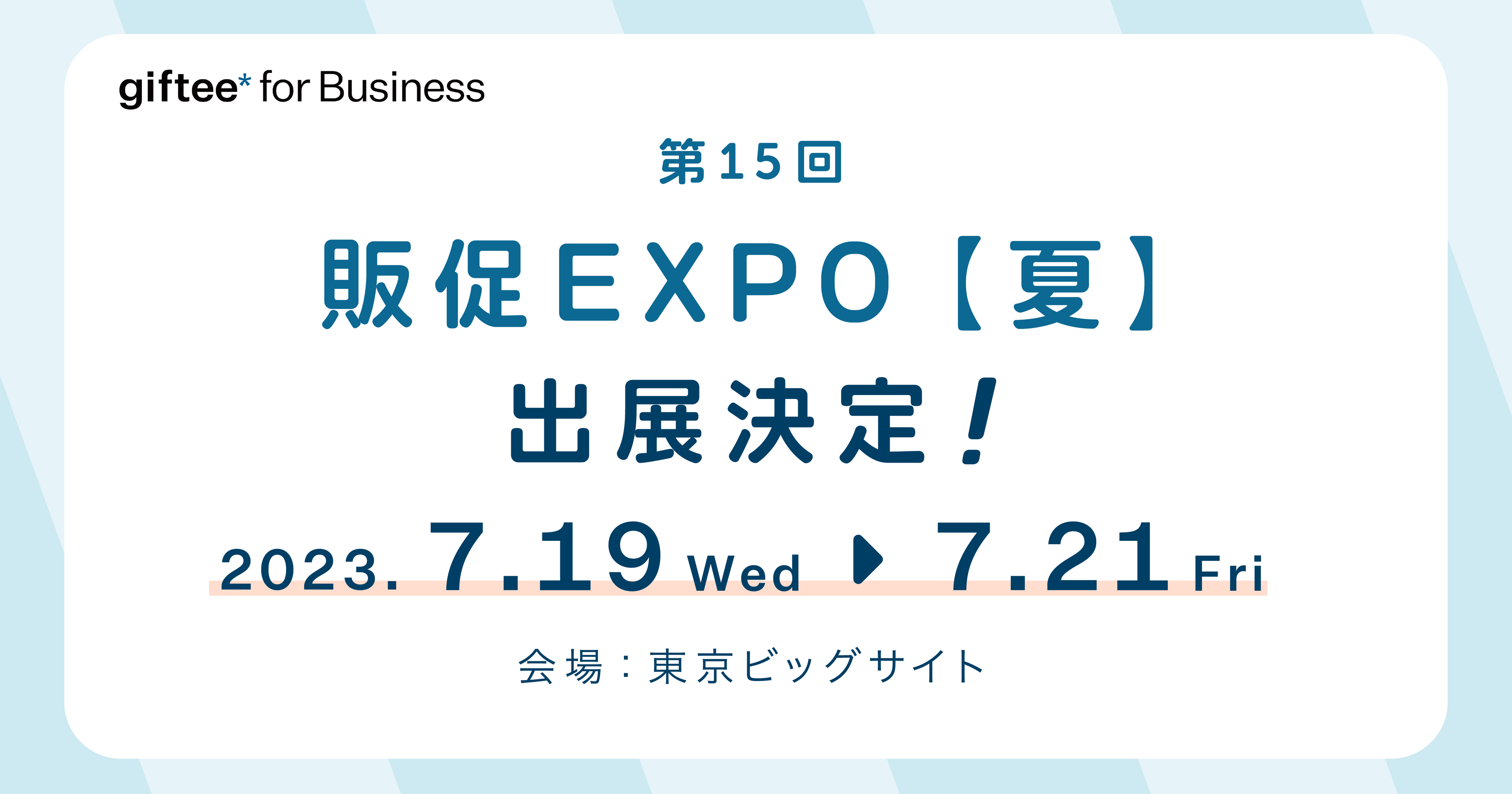 eギフトプラットフォーム事業(※1)を展開する株式会社ギフティ(本社:東京都品川区/代表取締役:太田 睦、鈴木 達哉/以下、ギフティ)は、デジタルギフトを活用した法人向けサービス「giftee for Business」を、2023年7月19日(水)〜21日(金)の期間、東京ビッグサイトで開催されるマーケティングの総合展「2023 Japanマーケティング Week【夏】」(主催:RX Japan株式会社)内の「第15回 販促EXPO【夏】」にブース出展いたします。