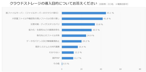 クラウドストレージの導入目的において最も多い回答は「脱ファイルサーバー(ファイルサーバーのクラウド移行)」で45.1%でした。2022年3月に実施した調査では同項目が33.9%(※)で、昨年から11.2pt増の結果となりました。