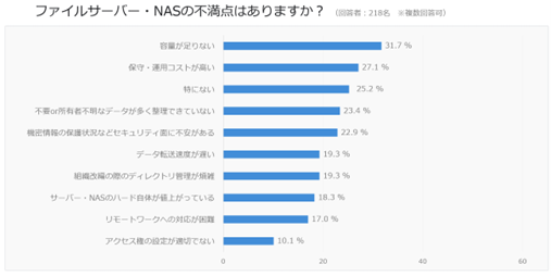 ファイルサーバー・NASの不満点には、「容量」と「コスト」に関する不満が高く、費用対効果の側面が重視されている