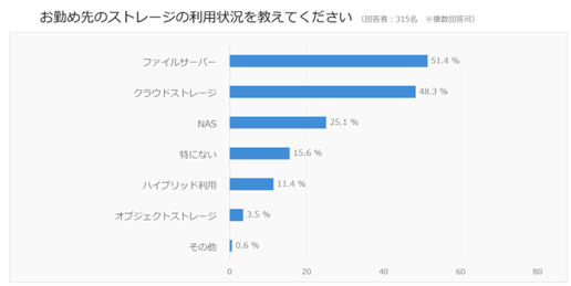 1位「ファイルサーバー(51.4%)」、2位「クラウドストレージ(48.3%)」、3位「NAS(25.1%)」、4位「特になし(15.6%)」、5位「ハイブリッド利用(11.4%)」