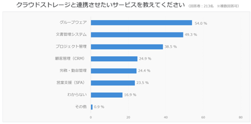 上位に「グループウェア」54.0%と「文書管理システム」49.3%が並んでおり、現状の社内システムや運用を維持したままクラウドストレージに移行できることが望まれていることが伺えます。
