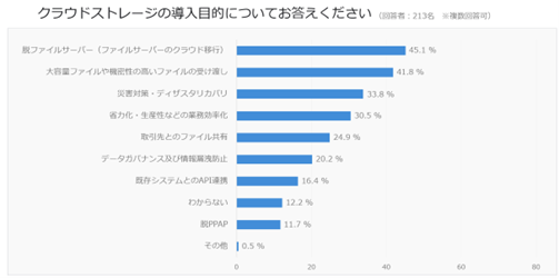 クラウドストレージの導入目的において最も多い回答は「脱ファイルサーバー(ファイルサーバーのクラウド移行)」で45.1%でした。2022年3月に実施した調査では同項目が33.9%(※)で、昨年から11.2pt増の結果となりました。