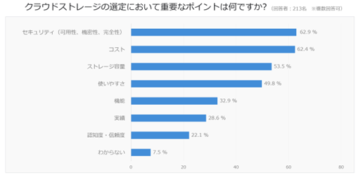 1位「セキュリティ(可用性、機密性、完全性)(62.9%)」、2位「コスト(62.4%)」、3位「ストレージ容量(53.5%)」、4位「使いやすさ(49.8%)」、5位「機能(32.9%)」