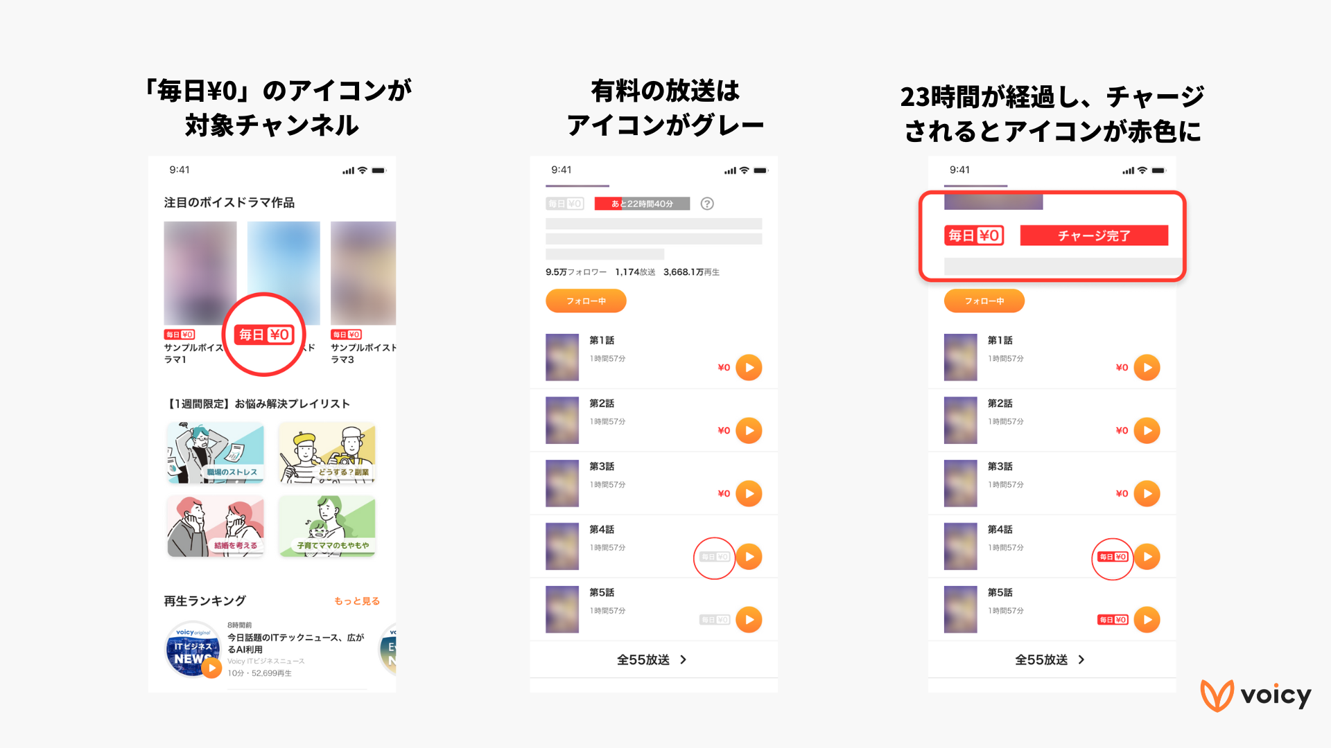 「毎日¥0」は、聴取した作品を23時間ごとに1話無料で聴き進められる機能です。対象チャンネルは、新たに登場したジャンル「ボイスドラマ」です。本機能は、アプリのみご利用いただけます。