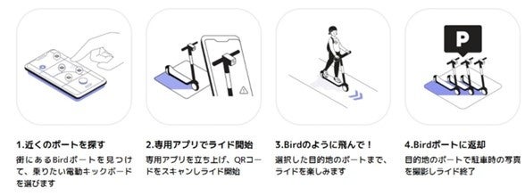スマートフォンアプリ「BIRD」をダウンロードし、会員登録、身分証の登録、交通ルールテストに合格後、近くの駐車ポートに置いてある電動キックボードのQRコードをスキャンすれば、好きな時に好きな場所へ手軽に移動できます。