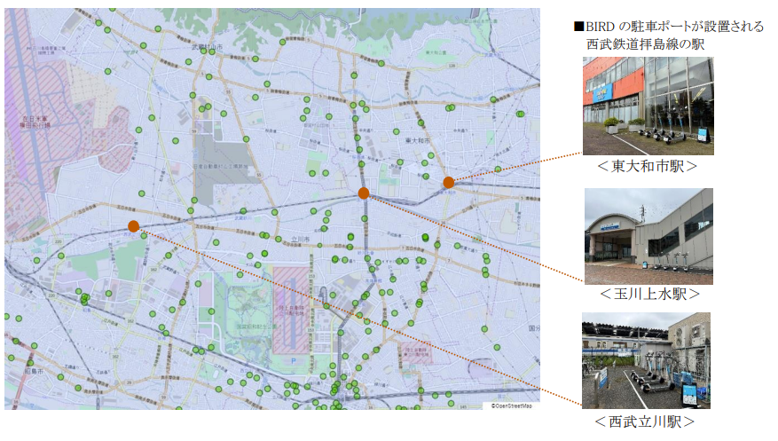地域の交通結節点である西武鉄道拝島線の東大和市駅・玉川上水駅・西武立川駅の駅前に駐車ポートを設置し、BIRDが展開する東大和市・武蔵村山市・立川市のラストワンマイルの移動ネットワークを構築することで、地域住民および来街者の交通利便性向上および公共交通機関の利用促進につながるかトライアルするものです。実証実験のエリア内には、約150の駐車ポートが存在し、今回の3駅前のポートが加わる事により、更に公共交通機関とのアクセスの向上が期待されます。