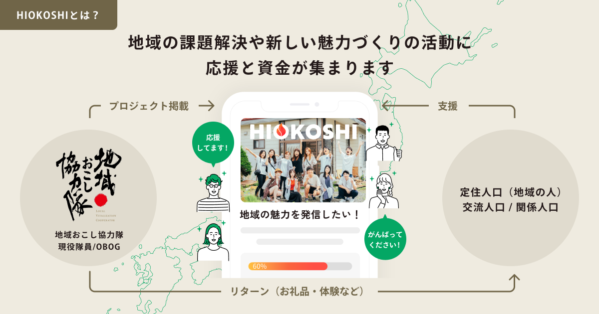 そこで、「地域おこし協力隊」を支援しているJOINと国内最大級のクラウドファンディングを運営するCAMPFIREが「HIOKOSHI」を共同運営することで、地域の課題解決や新たな魅力の創造を加速させます。