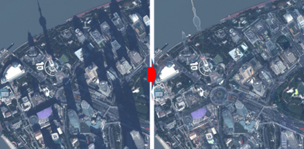 (左)人工衛星が撮影した街の画像。ビルの影部分は暗くて地上の様子が分かりづらい